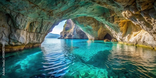 Inside view of a cave with turquoise waters of the Ionian Sea on Zakynthos Island, Greece , Cave, turquoise
