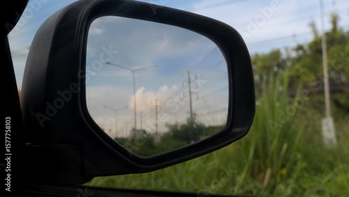Inside view of mirrors wing. Beside car with green grass. Inside mirror wing with top of grass under the sky.