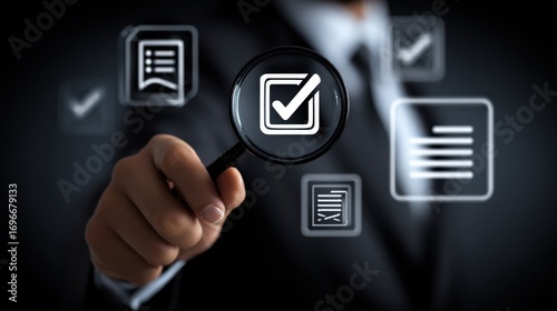 inspection, businessman, magnifying, glasses, verify, inspecting, quality, assurance, compliance, check, checklist, document, business, report, control, regulation, standard, process, management, system, approval, tick, mark, choice, right, correct, selected, agreements, symbol, graphic, icon, technology, digital, transformation, solution, analysis, review, assessment, examining, exam