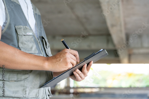 inspector or engineer is inspecting construction and quality assurance new house using a checklist. Engineers or architects or contactor work to build the house before handing it over to the homeowner