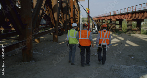 man, inspector, walk, construction, site, talk, path, uniform, together, bridge, building, examine, speak, professional, job, structure, negotiate, architecture, work, helmet, modern, inspect, way, hard hat, waistcoat, engineering, contractor, builder, industry, tied-up, conversation, check, colleague, safety, protect, communicate, co-worker, development, foreman, team, outdoors, backview, full-length, full body
