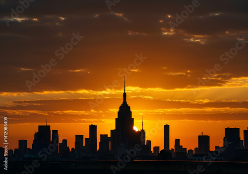 inspirational silhouette of a city skyline during majestic golden sunset with dramatic cloudy sky