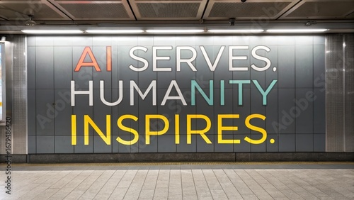 ai, humanity, urban art, motivational, digital artwork, inspiration, creativity, message, technology, communication, interior design, vivid colors, innovation, contemporary, advertising, graphic design, minimalism, eye-catching, city life, railroad station