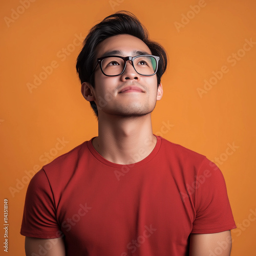 Inspirational young man looking upwards studio setting portrait photography warm environment close-up perspective positive mindset