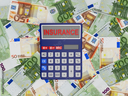 Insurance on the calculator screen on a pile of euro banknotes. 3d illustration