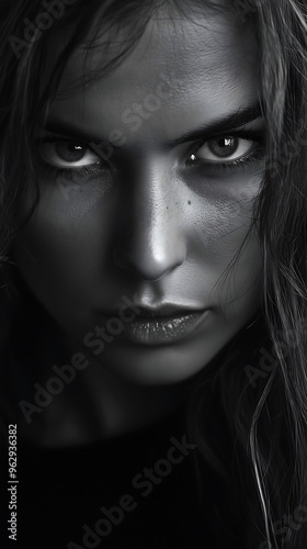 Intense Black and White Close-Up Portrait of a Woman with Piercing Eyes