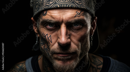 portrait, tattoo, intensity, gaze, bandana, piercing, beard, masculine, rugged, expression, closeup, face, ink, pattern, darkness, strength, defiance, character, wrinkle, eye, stare, intimidating, serious, tough, mature, adult, male, earring, stubble field, skin, forehead, nose, mouth, chin, cheek, eyebrow, eyelash, frown, grimace, emotion, mood, attitude, personality, confidence, determination, resilience, individuality, uniqueness, alternative