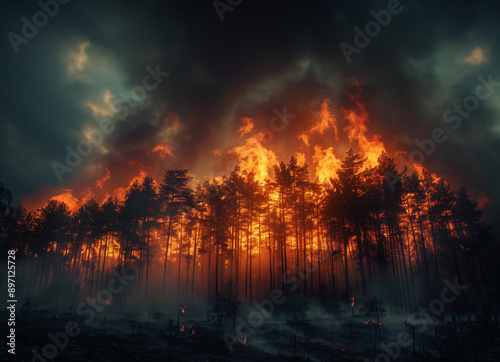 forest, fire, flames, tree, smoke, dusk, emergency, nature, disaster, wildfire, burn, destruction, environment, dangerous, heat, inferno, blaze, catastrophy, deforestation, ecology, fiery, glowing, hot, wood, climate change, crisis, danger, environmental issue, rescue, safety, ash, carbon, firefighter, alert, climate, ember, survival, impact, landscape, tragedy, conservation, devastation, ignition, generative, ai, illustration