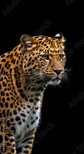 Intense gaze of a leopard, close-up face portrait showing spots and whiskers. Powerful wildlife photography mobile wallpaper, vertical big cat background screen graphic.