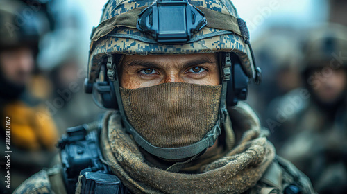 Intense gaze of a soldier wearing a helmet, highlighting determination and strength in a military setting