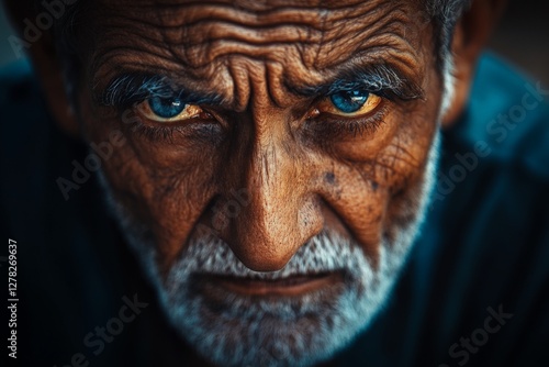Intense gaze of an elderly man with striking blue eyes and deep wrinkles in natural light