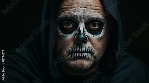 Intense Man in Skull Makeup with Hood on Dark Background for Halloween