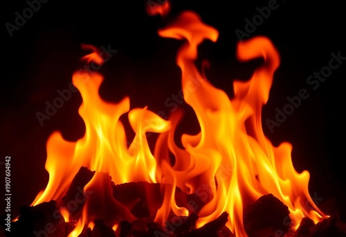 Intense orange and yellow flames burning against a dark background, blaze, ember