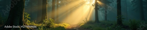 Intense rays of sunlight illuminating a misty forest, nature, forest, grunge
