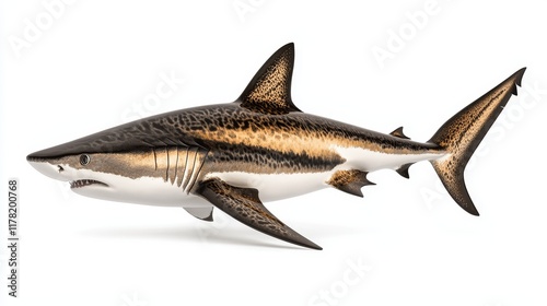 intense shark in aggressive posture, exaggerated fin details, high-resolution, isolated on white background