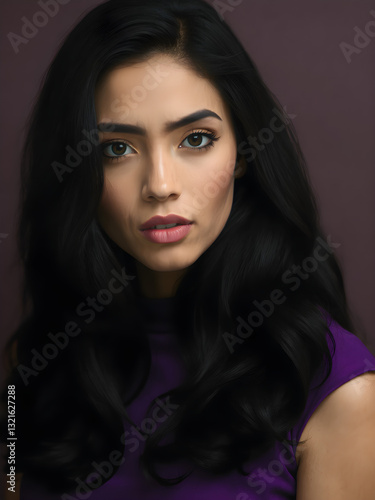 Intensidad en la mirada con un vestido morado y contrastes bien definidos.