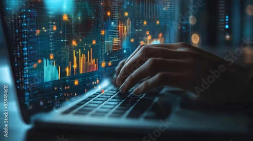 Interactive dashboard with real-time data graphs, hands typing on a keyboard