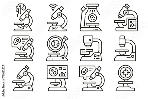 vector, icon, digital, imaging, holographic, lens, interactive, tool, scope, virtual, compound, device, microscope, observation, analysis, smart, ai, nano, magnification, intelligent, scientific, silhouette, solid, black, glyphs, symbol, collection, pictogram, set