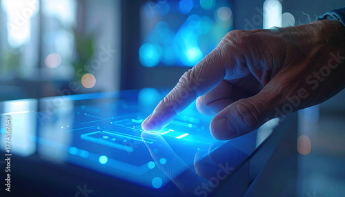 Interactive Touch Technology: A person's finger interacts with a modern, glowing touchscreen, representing innovation and future technology. It symbolizes digital interface, technology control.
