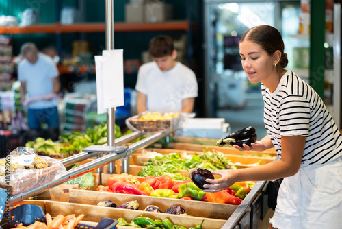 Interested young woman shopping for organic vegetables in local farm store, choosing fresh ripe aubergines from boxes on produce display..