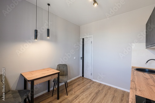 interior apartment kitchen and dining room, refectory area, cooking equipment, table furniture, stove
