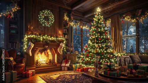 Interior christmas. magic glowing tree, fireplace, gifts.