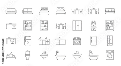 icon, symbol, furniture, vector, design, interior, home, outline, house, layout, chair, plan, drawing, line, blueprint, set, table, apartment, project, room, element, sofa, architectural, illustration, isolated, kitchen, graphic, office, modern, bedchamber, bathroom, bed, thin, topview, technical, vignetting, floor, construction, armchair, white