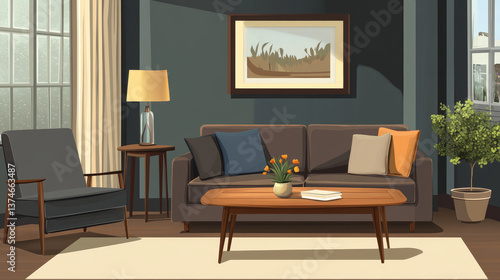 Interior design of cozy living room interior with mock up poster frame, brown sofa, gray armchair, wooden coffee table, beige carpet and personal accessories. Home decor. Template.
