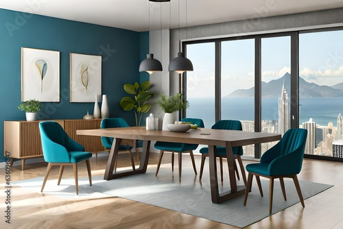Interior design of modern dining room, wooden table and blue chairs 3d rendering. Modern dining room. Template