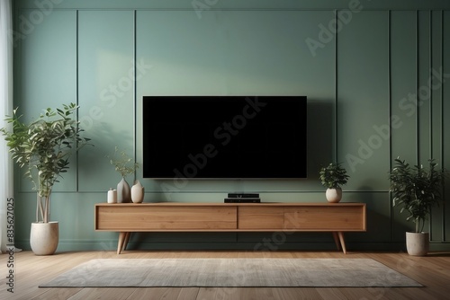 Interior home of living room with TV LED cabinet on pastel green wall, hardwood floor