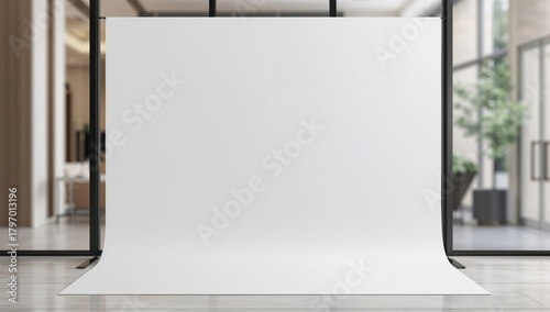Interior lobby and hallway banner mockup, abstract backdrop featuring a white marble stone tabletop with a blurred glass window, suitable for product display