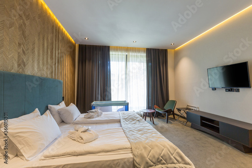 bed, interior, luxury, home, baby, cot, furniture, wood, room, bedchamber, hotel, design, pillow, modern, apartment, decor, comfortable, house, floor, contemporary, architecture, style, white, television, wall, lamp, living, beautiful, window, elegance, decoration, sleep, rest, relaxation, bedding, light, background, nobody, indoor, clean, chair, table, domestic, classic, suite, carpet, building