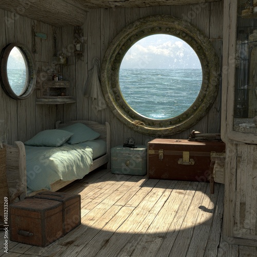 Interior of a rustic ship's cabin with a porthole view of the sea.