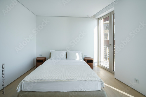 Interior of a spacious light bedroom with windows in a luxury villa