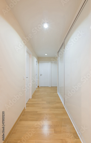 Interior of a white corridor with sliding door closet and wooden parquet
