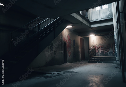 Interior Of Abandoned Building, a run down building with graffiti all over the walls. abandoned factory with light flooding though broken windows of rusting industrial machinery. Generated AI