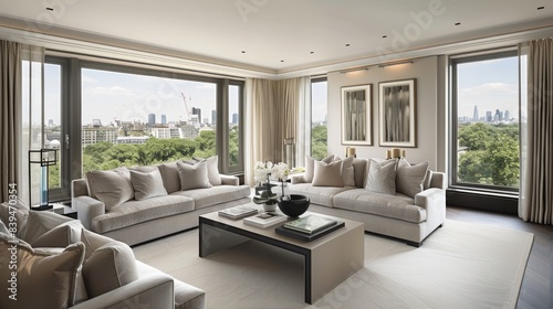 Interior of light living room with grey sofas, coffee table and large window