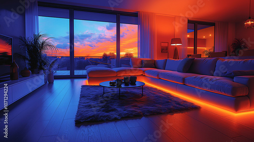 lighting, carpet, glowing, home, beige, space, houseplant, modern, illuminated, stylish, cushion, design, comfortable, apartment, hot drink, furniture, comfort, relax, unit, trend, style, evening, blanket, light, element, real estate, night, late, interior, beautiful, flat, cosy, living room, house, object, table, dark, lamp, couch, grey