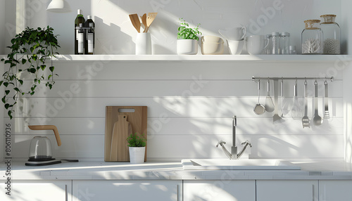 Interior of modern kitchen with white counters, shelf, sink and utensils