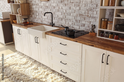 apartment, appliance, background, beautiful, brick, carpet, clean, hot drink, colours, comfort, comfortable, contemporary, cooking, counter, counter, cosy, decor, design, detail, drink, equipment, flat, floor, food, furniture, home, house, household, indoor, interior, kitchen, kitchen utensile, modern, nobody, object, pot, prepare, shelving, sink, stove, style, stylish, table, trend, unit, utensil, wall, white