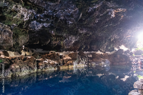 Interior of the cave of Los Jameos del Agua. Light at the end of the cave. Lanzarote, Canary Islands, Spain.