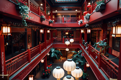 interior of the Chinese-style building is red, The lights inside the house glow in an ancient style, creating an atmosphere filled with festive lantern decorations for celebrating New Year's Eve.