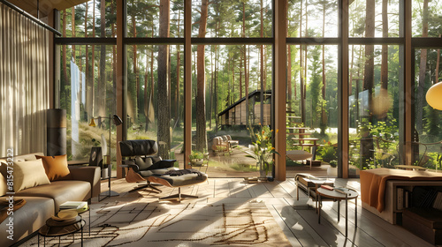 Interior of vacation rental forest lodge countryside cabin with large terrace and big window among trees for holidays in the wilderness Modern hideaway cottage in wild pine forest on r : Generative AI