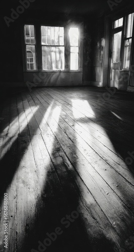 Interior shadows on aged wooden floor. Sunlight streams through windows, casting dramatic shadows on a weathered wooden floor