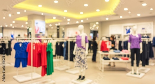 Interior view of a brightly lit clothing store with racks of apparel and mannequins on display