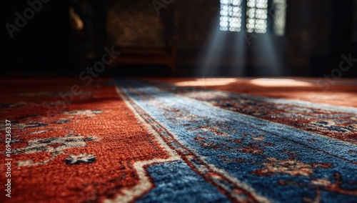 mosque, carpet, interior, sunlight, window, prayer, muslim, patterned, red, blue, dark, light, texture, detail, ornate, design, sharpened, closeup, soft, warm, spiritual, religious, tradition, faith, illuminated, ancient, history, culture, islam, architecture, ornamental, detail, woven, colourful, pattern, islamic, geometric, traditional, devotion, worship, rug, empty, calm, peaceful, radiant