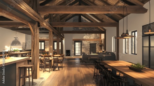 interior, room, wood, beam, furniture, table, chair, floor, design, architecture, light, home, house, dining, living, style, modern, rustic, decor, decoration, wooden, contemporary, open, space, apartment, residential, indoor, hardwood, ceiling, structure, construction, building, empty, nobody, comfortable, cosy, elegant, luxury, minimalist, neutral, perspective, interior design, real estate