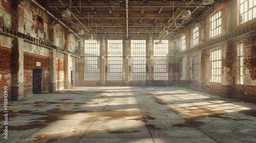 Interior view of an old rundown and abandoned factory building Big empty room with brick walls exposed beams and florescent light fixtures hanging form the ceiling : Generative AI