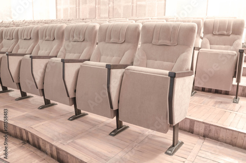 Interiors empty beige cinema chairs seats in low-key indoors.