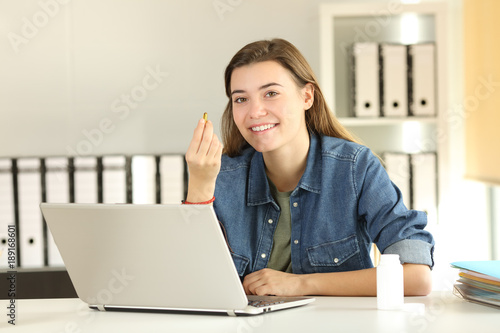 supplement, vitamin, showing, pill, hand, holding, omega, three, office, intern, trainee, employee, diet, work, men at work, teenage, teenage, businesswoman, energy, vitality, capsule, person, satisfied, woman, looking, camera, you, nourishment, healthy, medicine, medication, weight loss, medicine, happy, people, smiling, girl, business, treatment, health, care, young, adult, dietetic, secretary, self, employed, freelance, entrepreneur